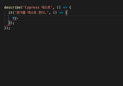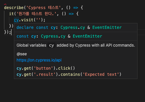 Cypress가 제공하는 cy에 대한 인텔리전스가 잘 나옵니다...!
