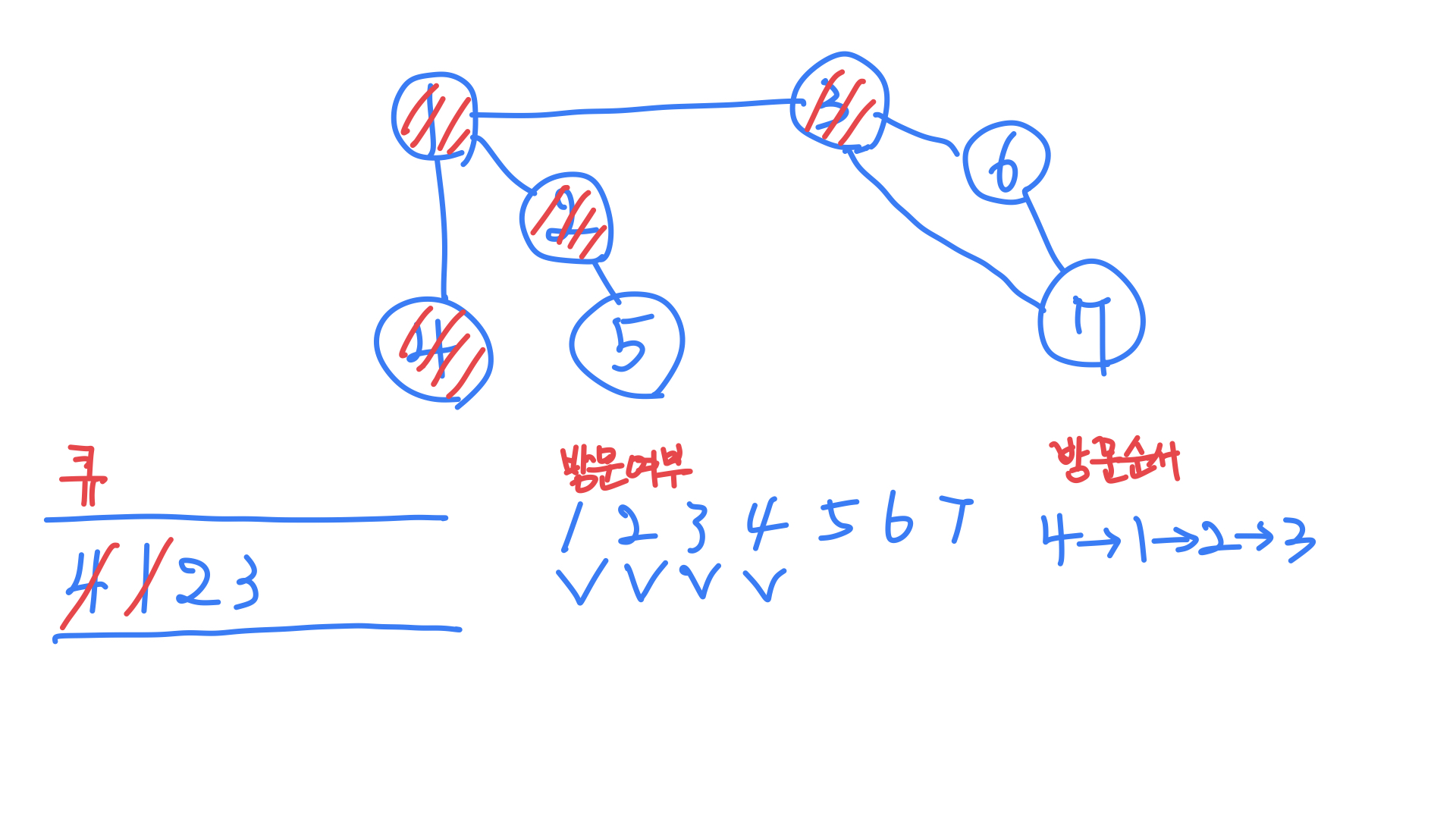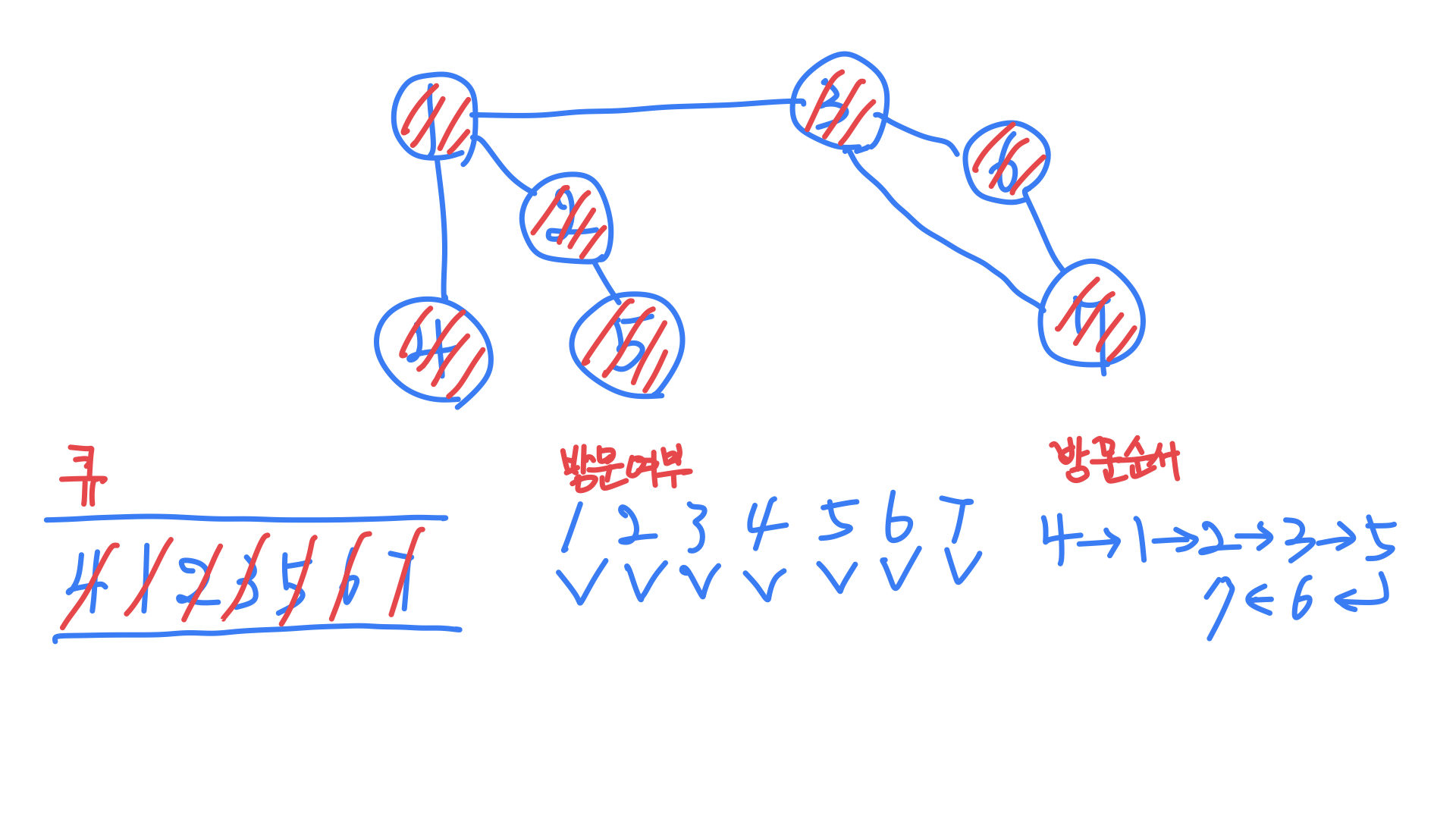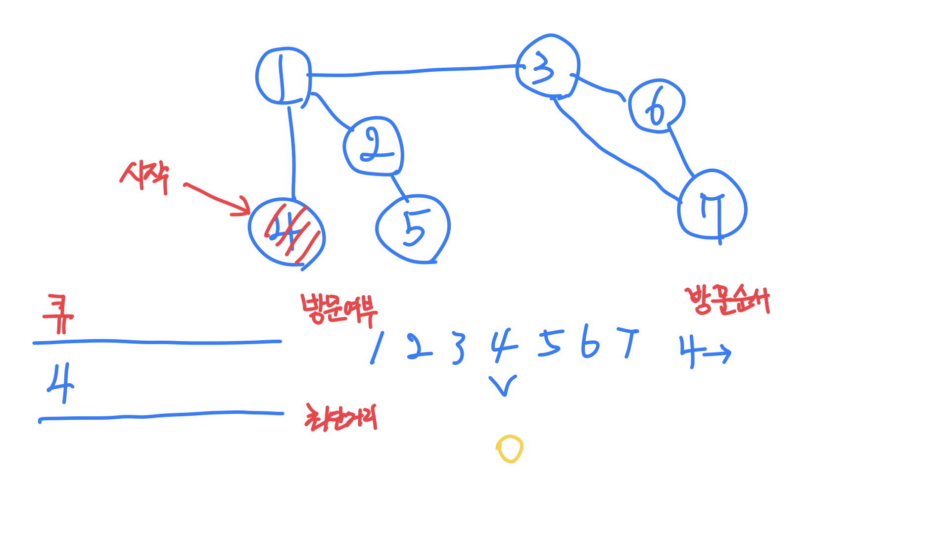 큐는 현재 노드로부터 인접한 노드들을 담아주는 역할을 해줍니다.