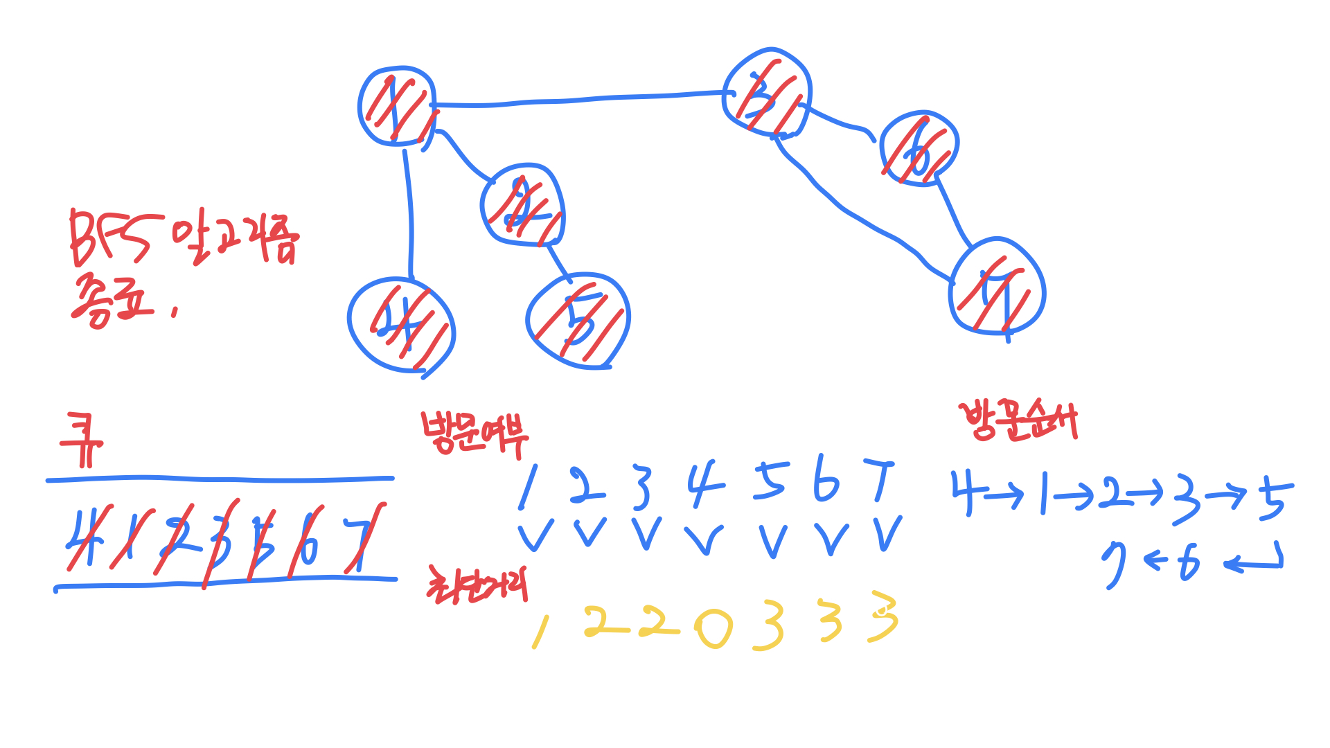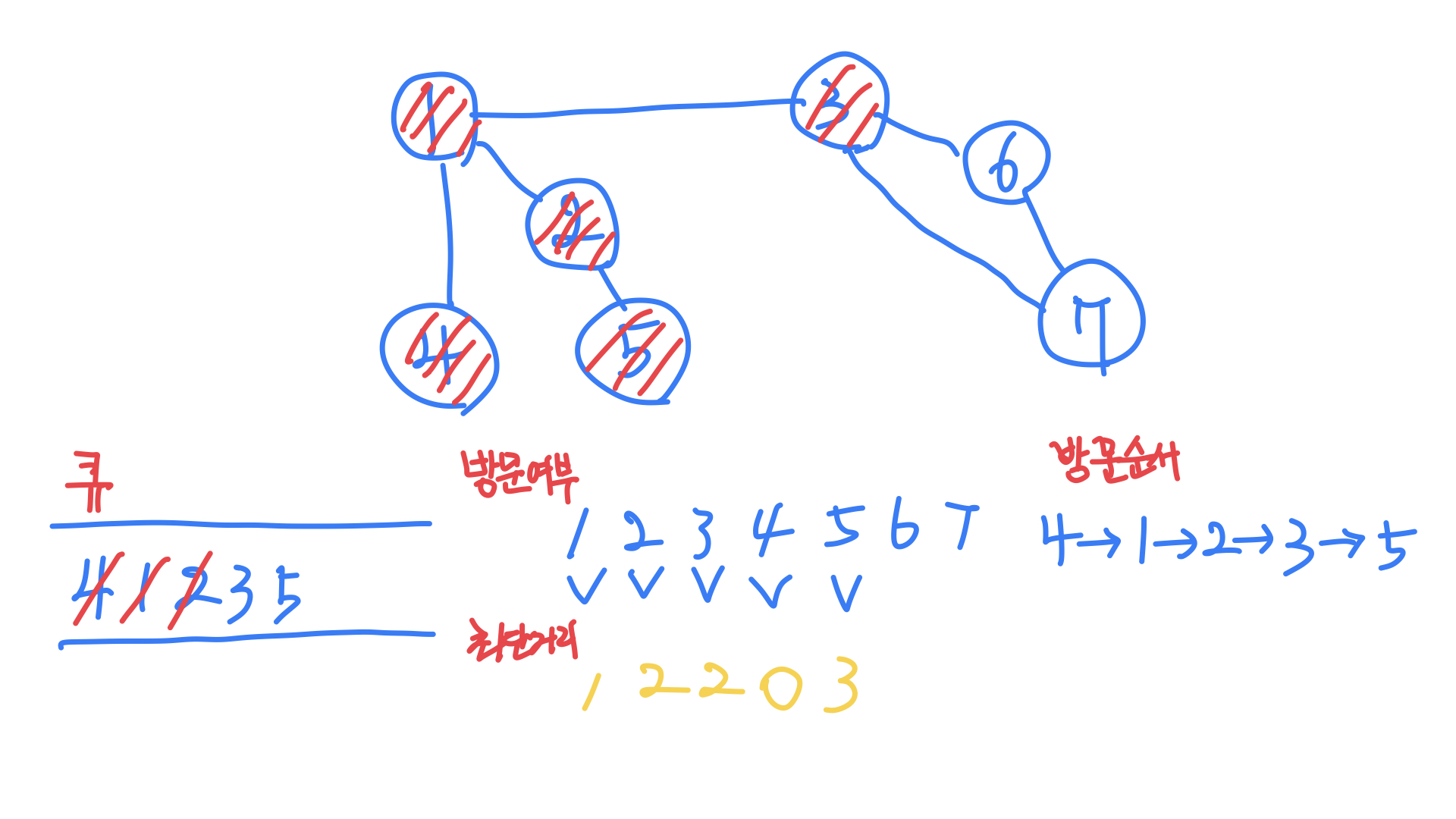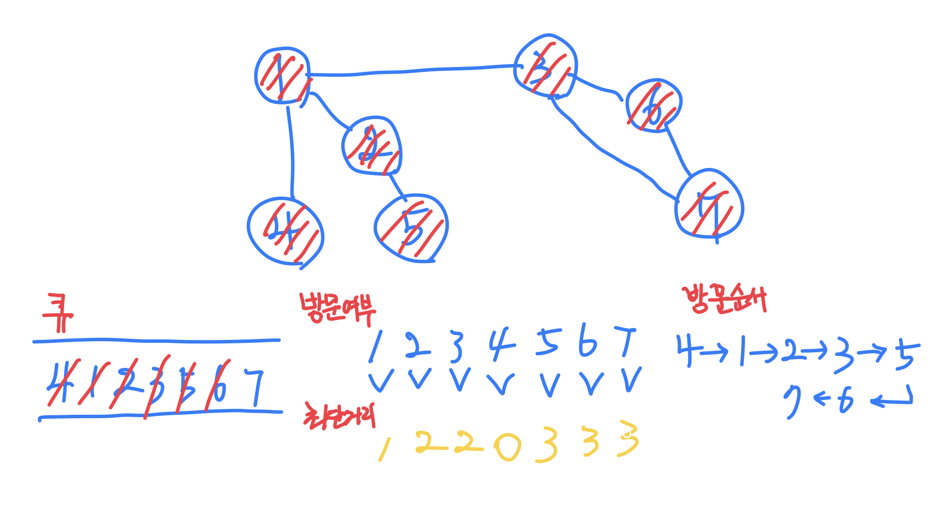 큐는 현재 노드로부터 인접한 노드들을 담아주는 역할을 해줍니다.