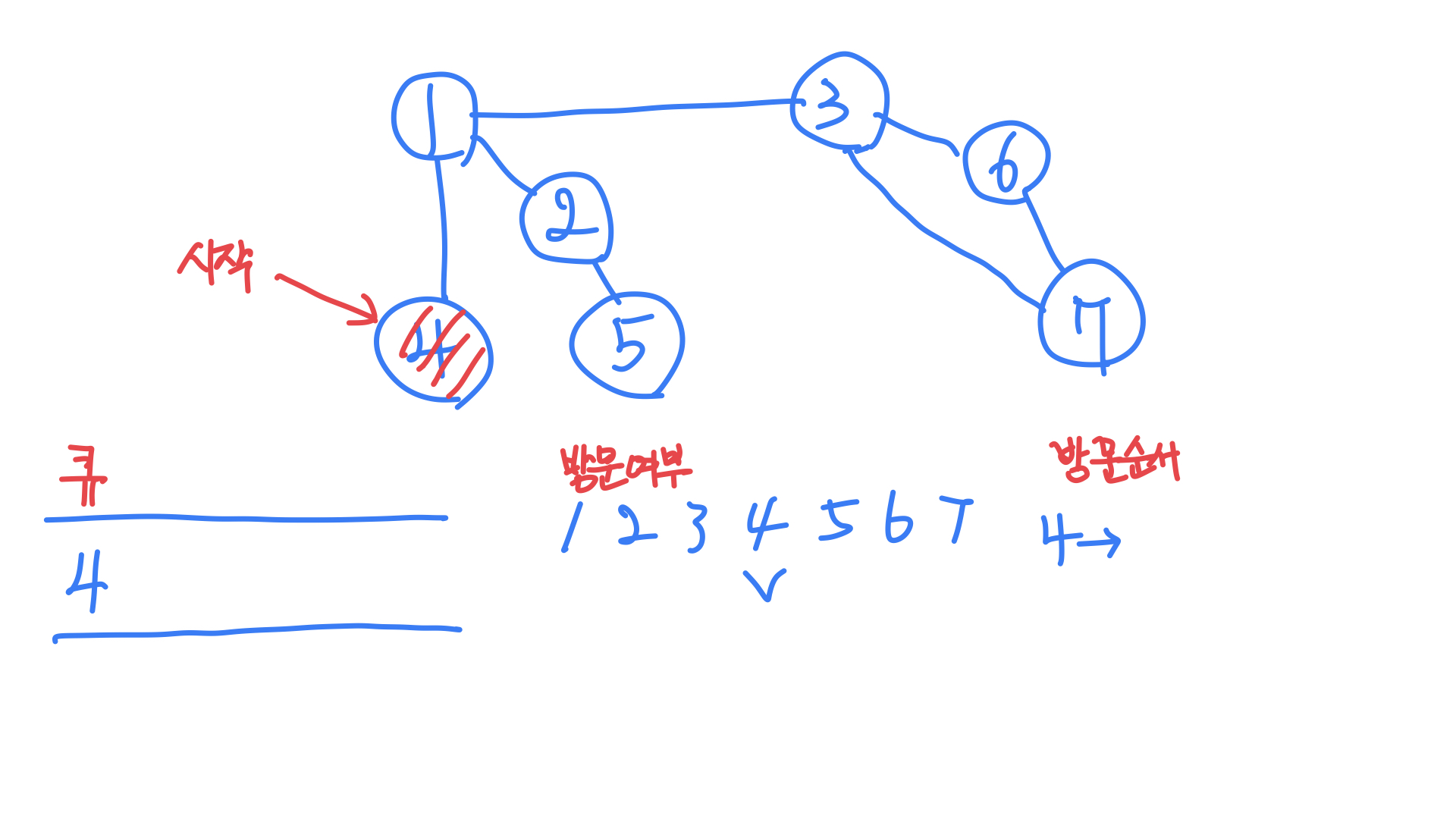 3. 큐에서 노드를 제거한 후, 해당 노드의 모든 인접 노드 중에서 방문하지 않은 노드들을 큐에 삽입하고 방문체크를 합니다.