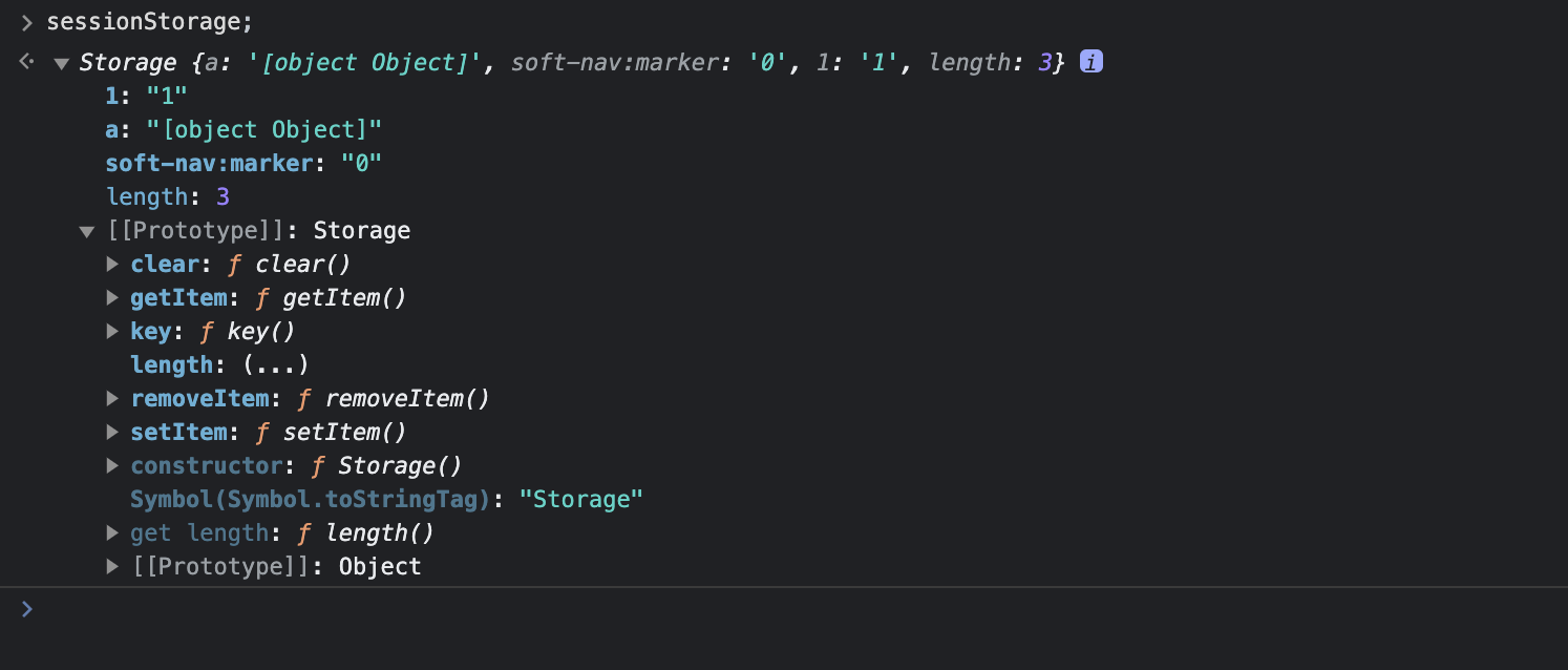 보시면 sessionStorage 내부가 아닌 Storage.prototype 객체에 스토리지의 메소드들이 구현이 되어 있습니다.