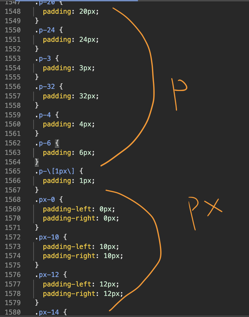 개발자 도구를 열어서, 유틸리티 클래스 파일을 살펴보면 그 원인을 알게 됩니다!px 클래스 선택자들은 p 클래스 선택자들보다 뒤에,pl 클래스 선택자들은 px 클래스 선택자들보다 뒤에 위치해 있기 때문입니다.
