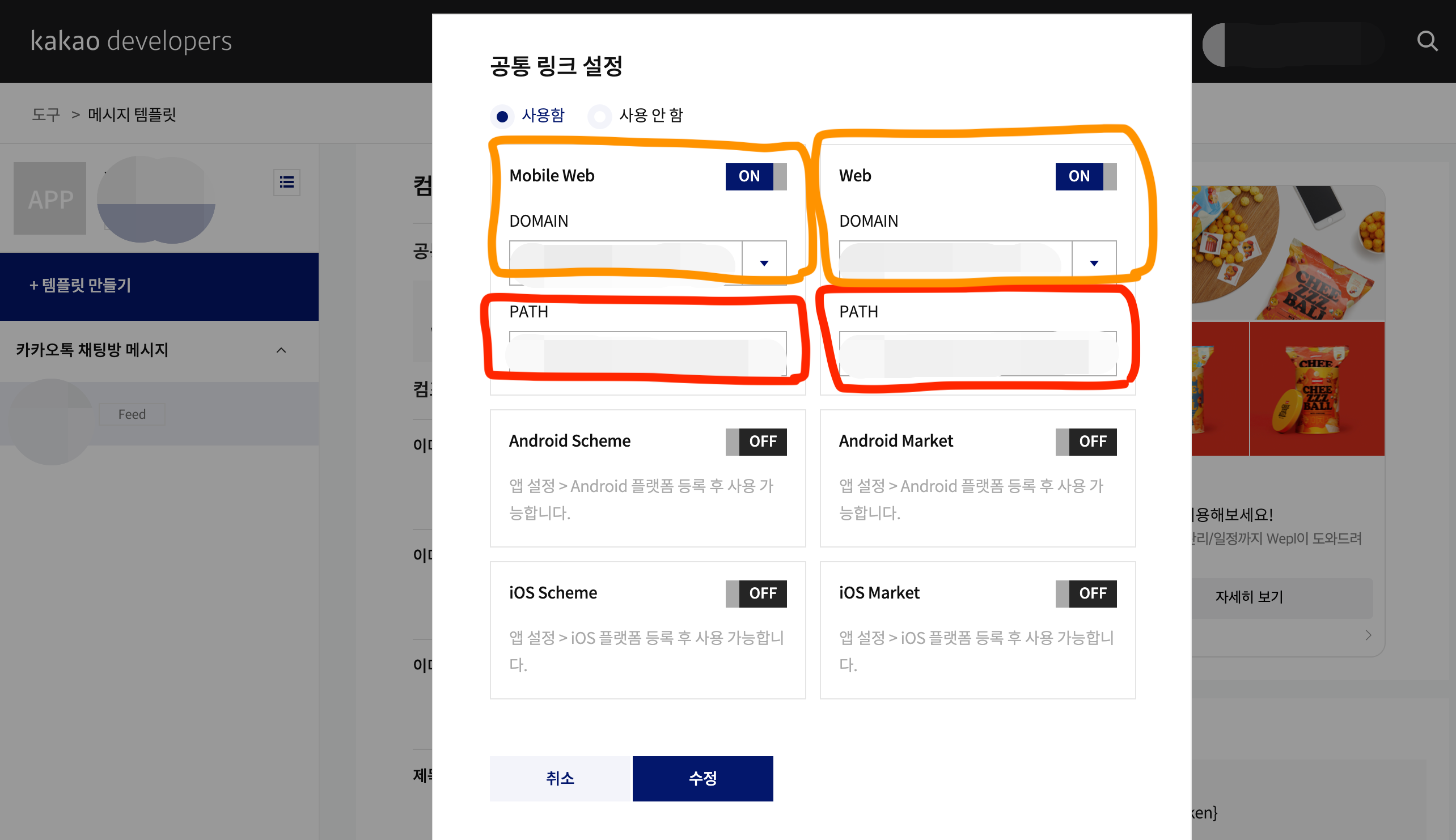 공통 링크에서 수정을 누르시면 창이 하나 나옵니다.DOMAIN은 지정해둔 도메인을 설정할 수 있는 영역이고요.PATH에 앞에서 설정한 사용자 인자를 넣어 줄 수 있습니다.
